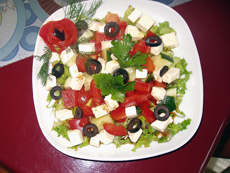 (сыр «Фета», помидоры, огурцы, перец болгарский, маслины, лист салата)